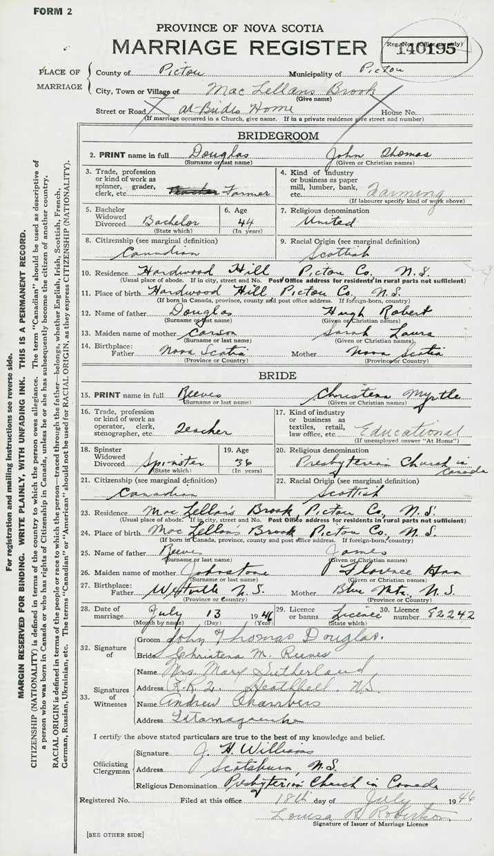 28. Date of marriage July 13 1946 29. By license or banns License 30. License number 82242