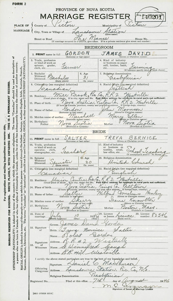 PLACE OF MARRIAGE County of Pictou