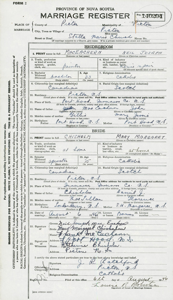 11. Place of birth Port Hood, Inverness County