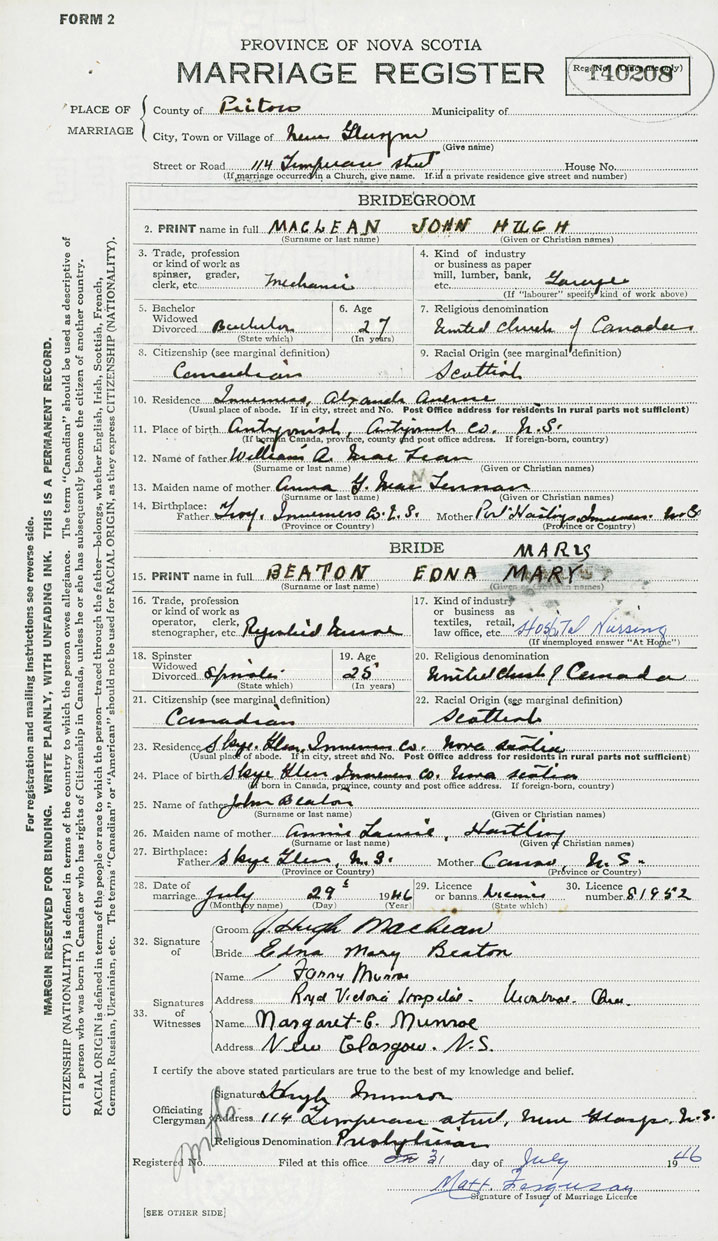 28. Date of marriage July 29 1946 29. By license or banns License 30. License number 81952