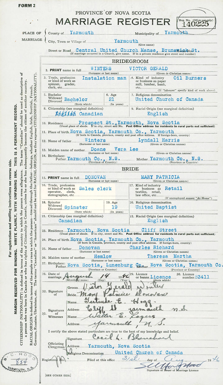 28. Date of marriage August 14 1946 29. By license or banns License 30. License number 83411