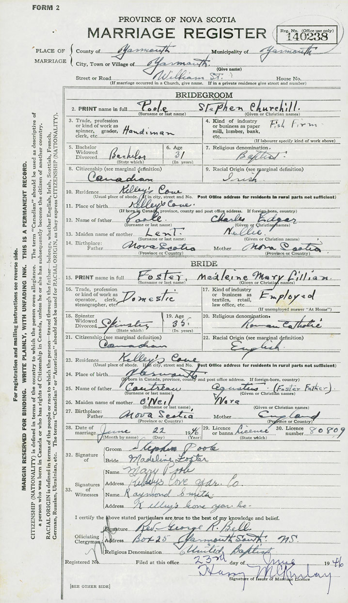 28. Date of marriage June 22 1946 29. By license or banns License 30. License number 80809