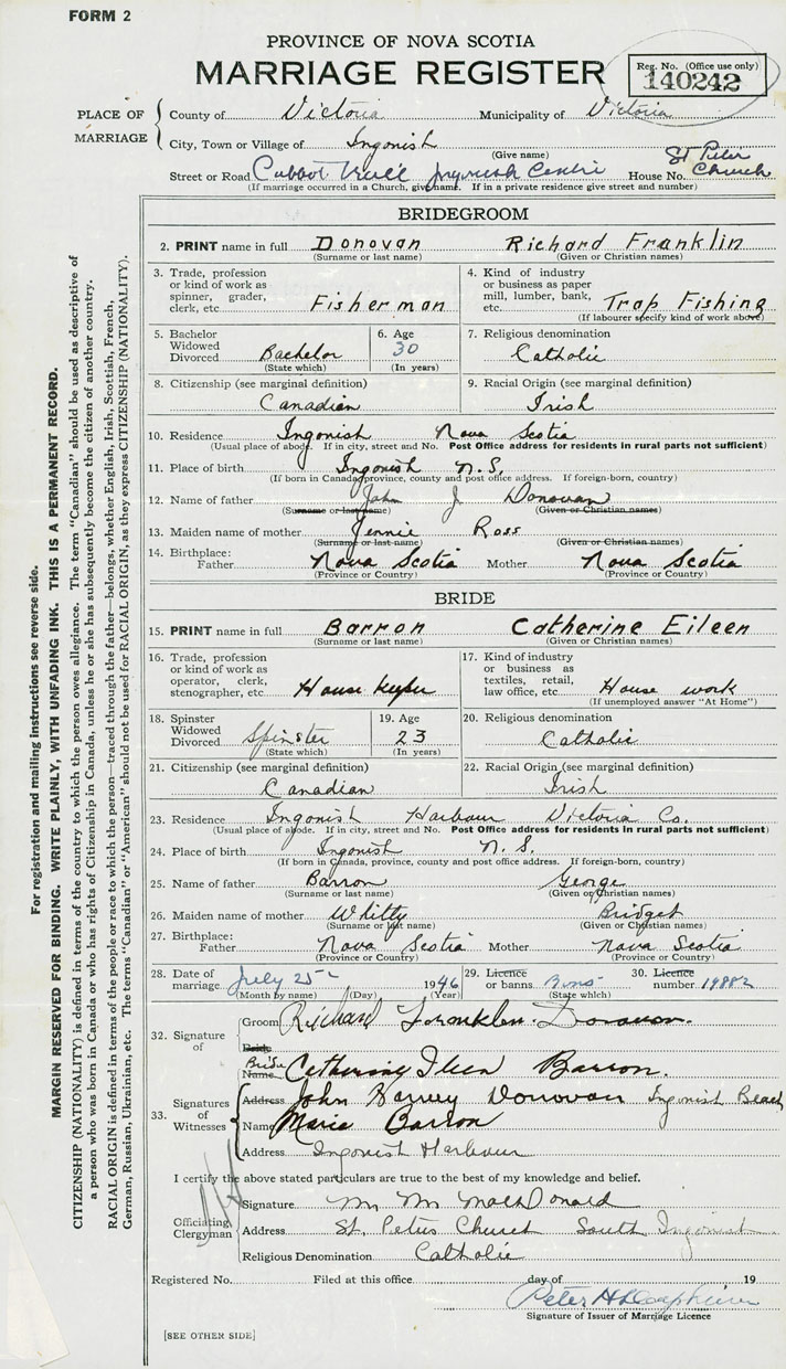 24. Place of birth Ingonish