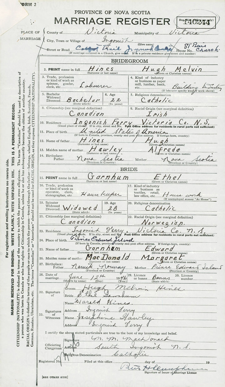 28. Date of marriage June 12 1946 29. By license or banns License 30. License number