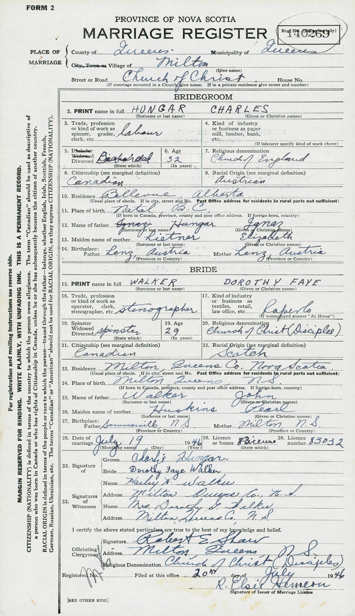 28. Date of marriage July 19 1946 29. By license or banns License 30. License number 83032