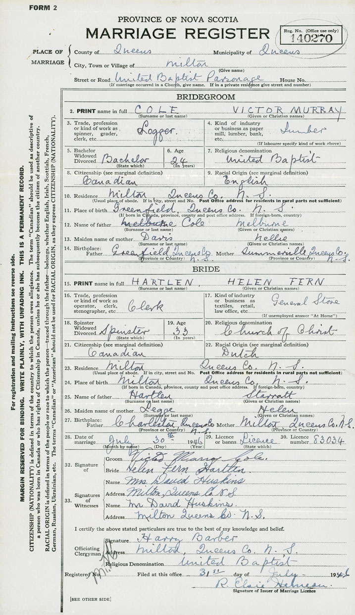 28. Date of marriage July 30 1946 29. By license or banns License 30. License number 83034