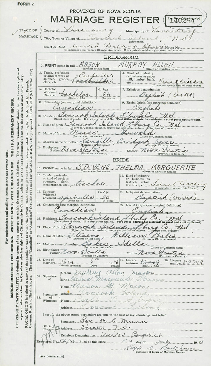 28. Date of marriage July 6 1946 29. By license or banns License 30. License number 82749