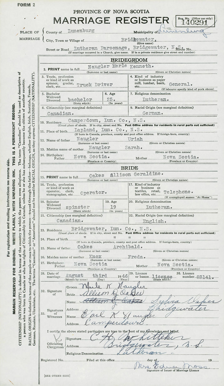 28. Date of marriage August 3 1946 29. By license or banns License 30. License number 83141