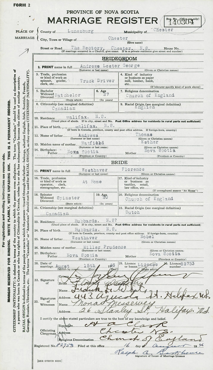 28. Date of marriage August 15 1946 29. By license or banns License 30. License number 83753