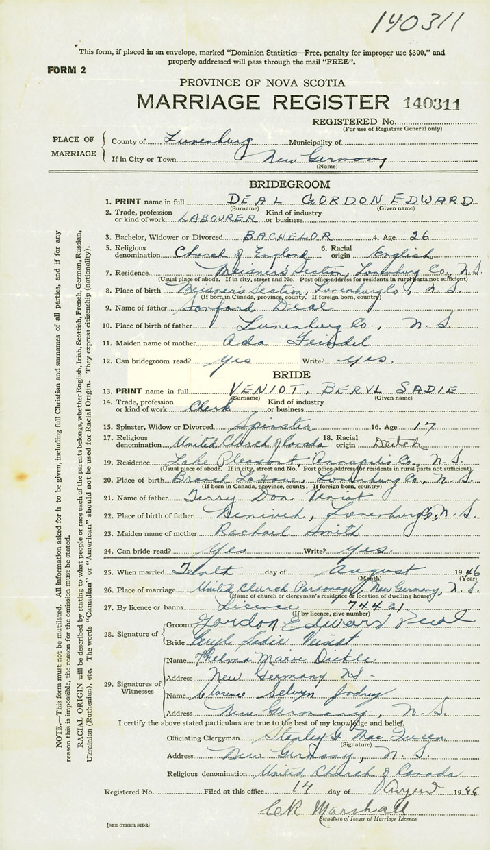 PLACE OF MARRIAGE County of Lunenburg in City or Town New Germany