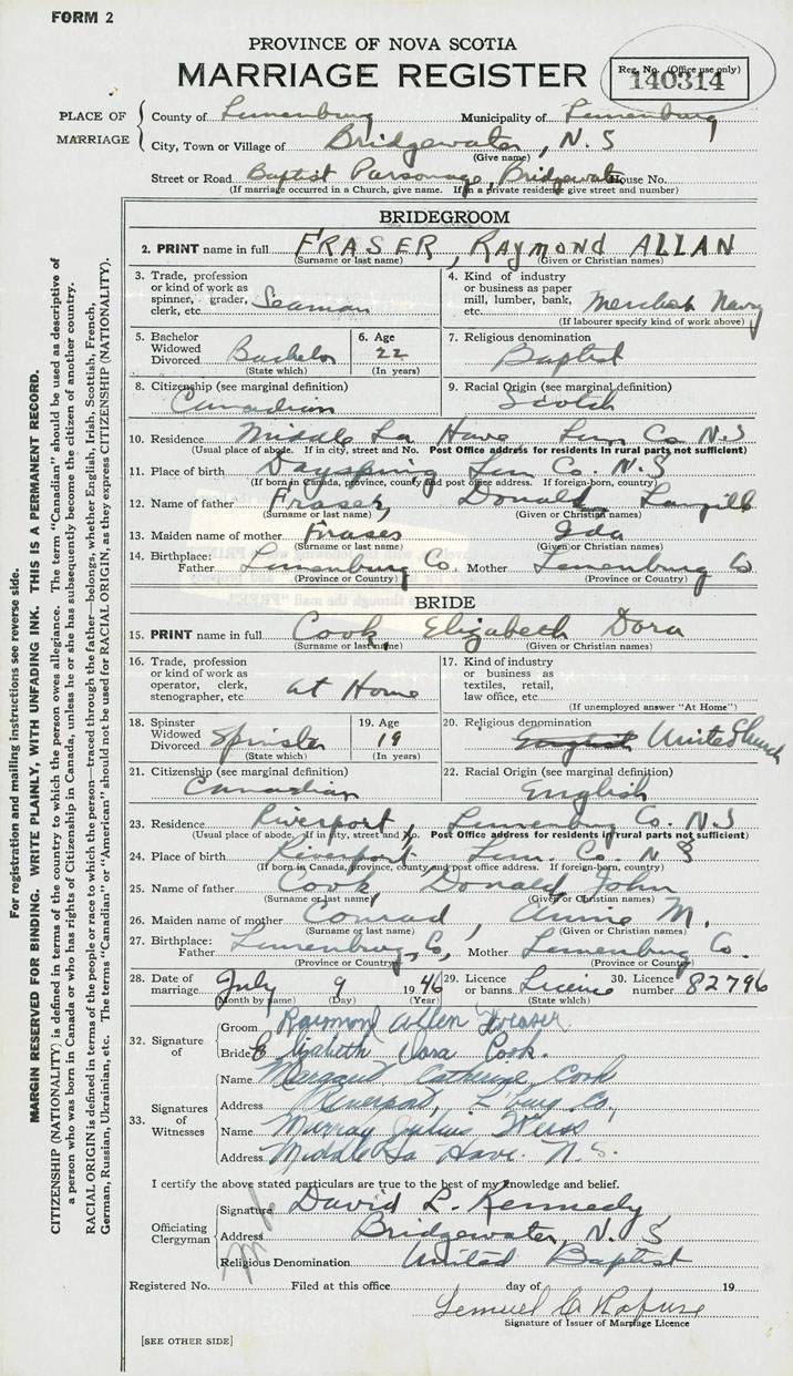 28. Date of marriage July 9 1946 29. By license or banns License 30. License number 82796