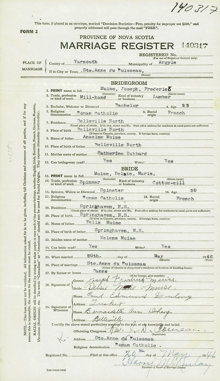 26. Place of marriage Ste. Anne du Ruisseau Ste-Anne-du-Ruisseau, Yarmouth County