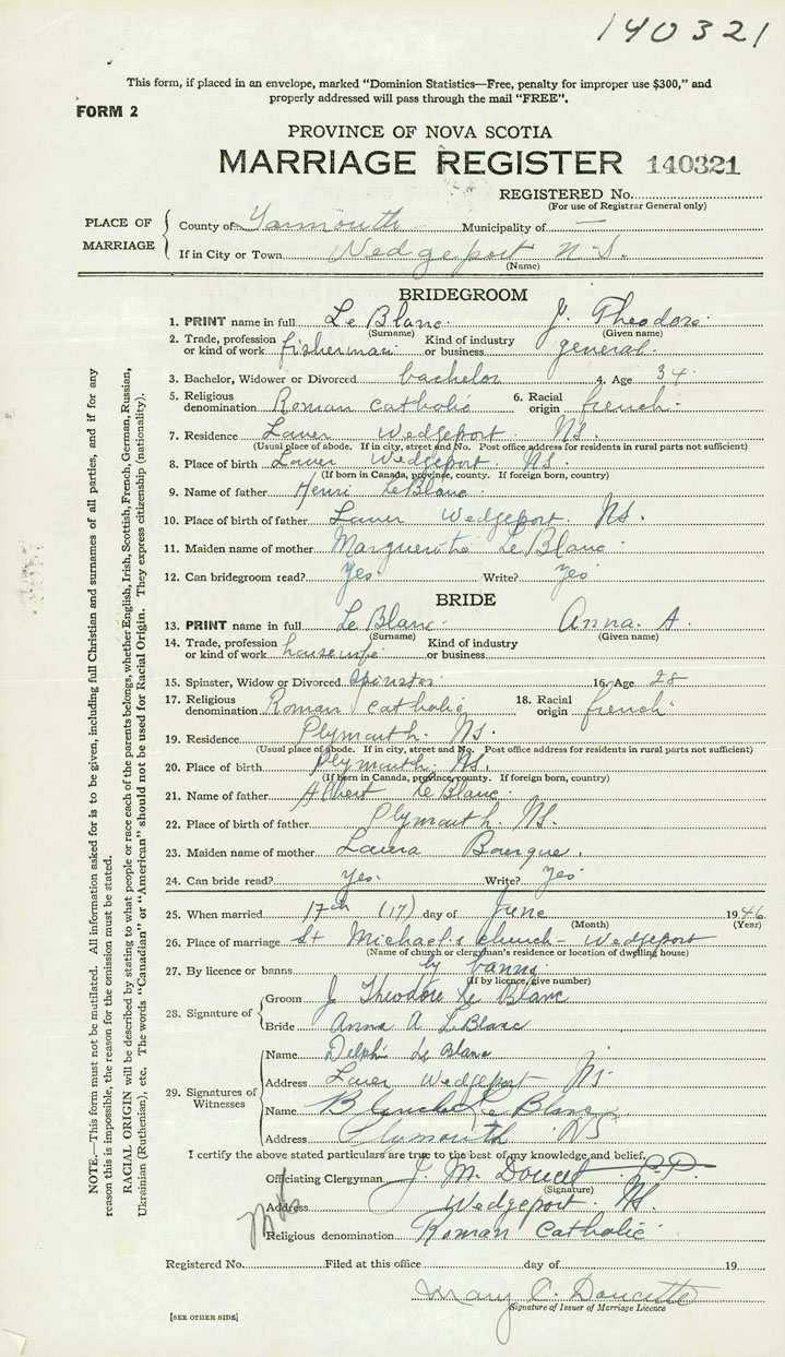 PLACE OF MARRIAGE County of Yarmouth in City or Town Wedgeport