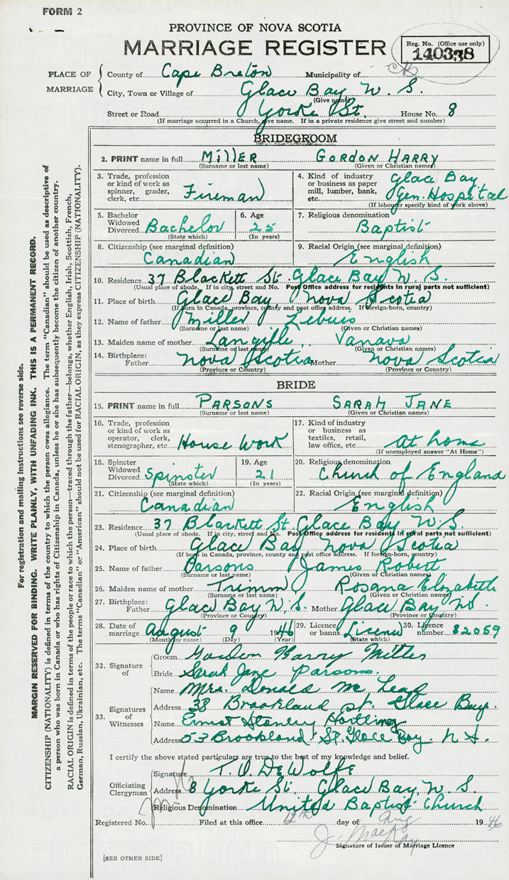 27. Birthplace Father Glace Bay Mother Glace Bay