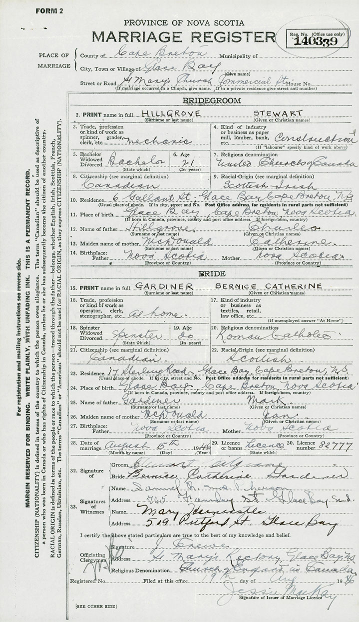 28. Date of marriage August 15 1946 29. By license or banns License 30. License number 82777