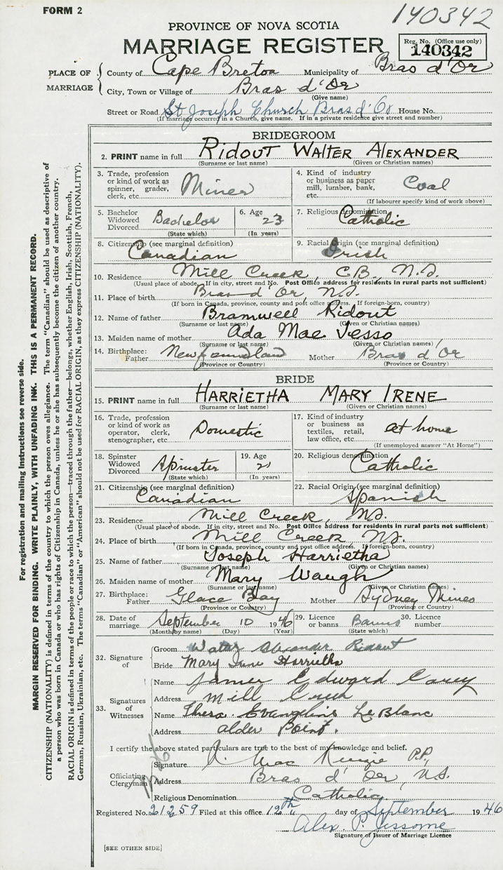 14. Birthplace Father Newfoundland Mother Bras d'Or