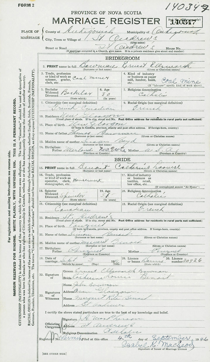 28. Date of marriage September 3 1946 29. By license or banns License 30. License number 20926
