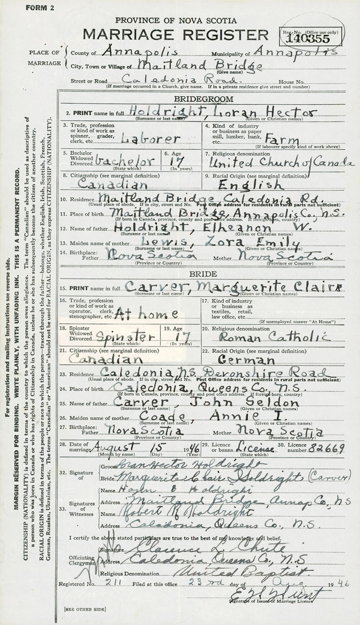 28. Date of marriage August 15 1946 29. By license or banns License 30. License number 82669