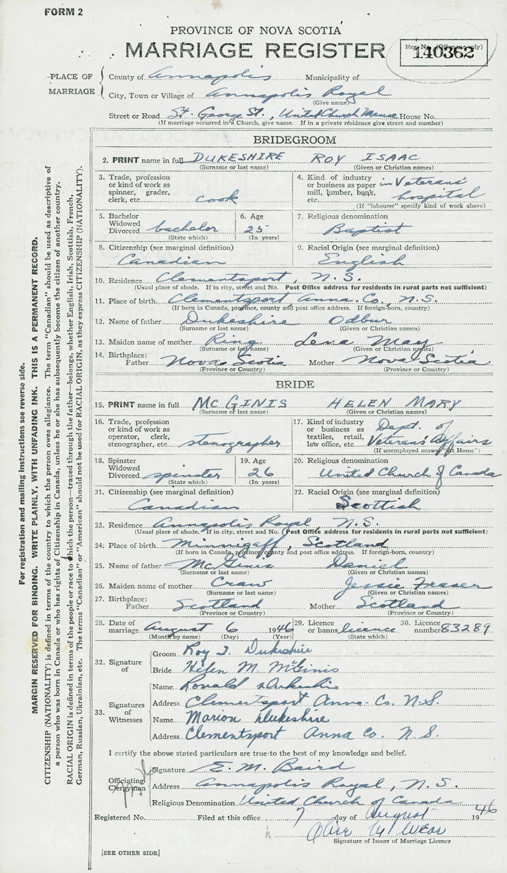 28. Date of marriage August 6 1946 29. By license or banns License 30. License number 83289