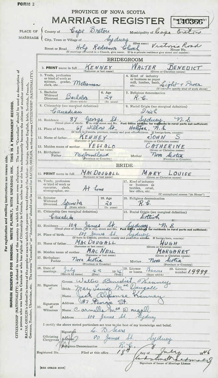 28. Date of marriage July 16 1946 29. By license or banns License 30. License number