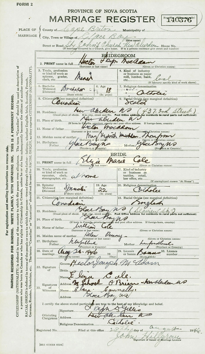 14. Birthplace Father Glace Bay Mother Glace Bay