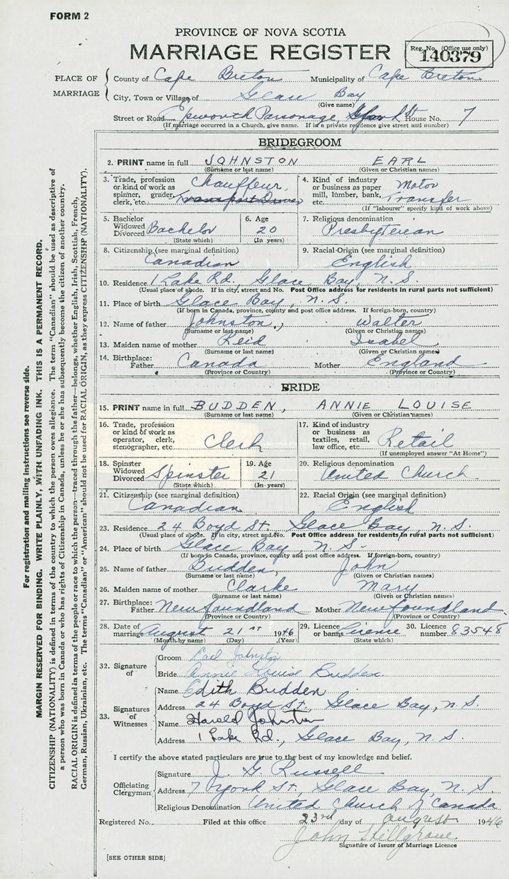 28. Date of marriage August 21 1946 29. By license or banns License 30. License number 83548