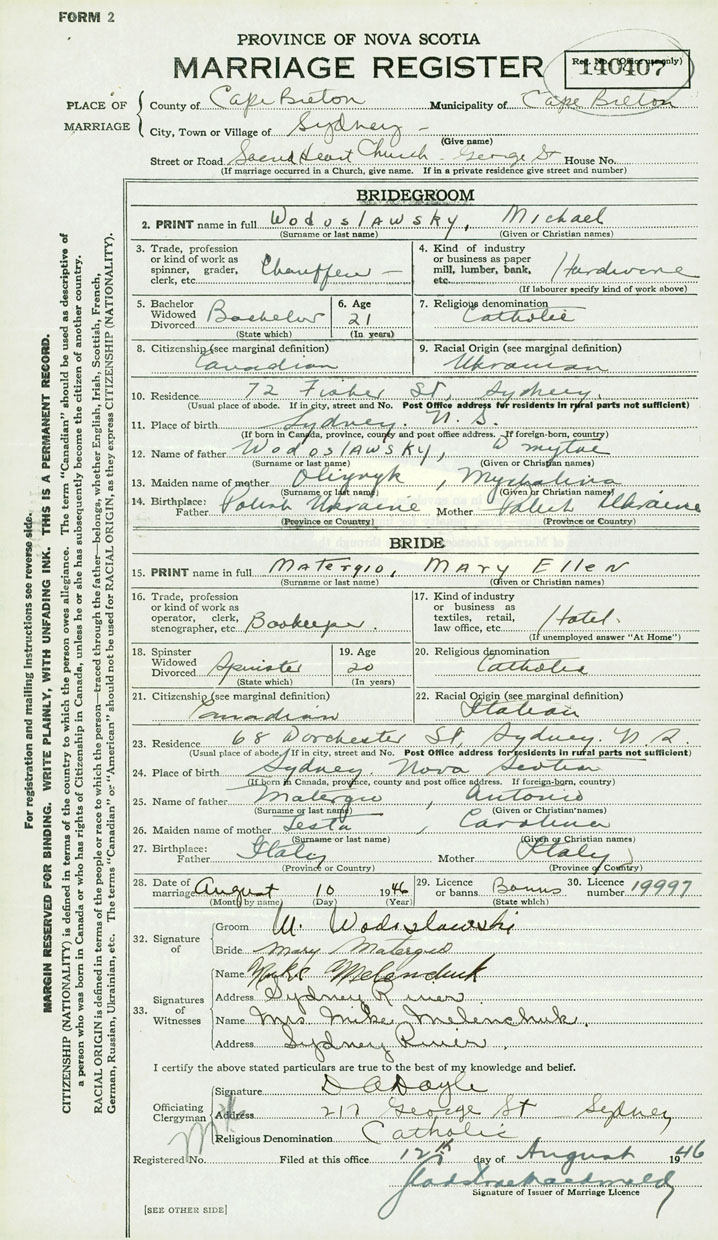 28. Date of marriage August 10 1946 29. By license or banns License 30. License number