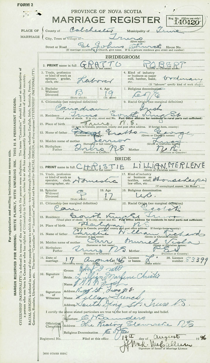 28. Date of marriage August 17 1946 29. By license or banns License 30. License number 83399