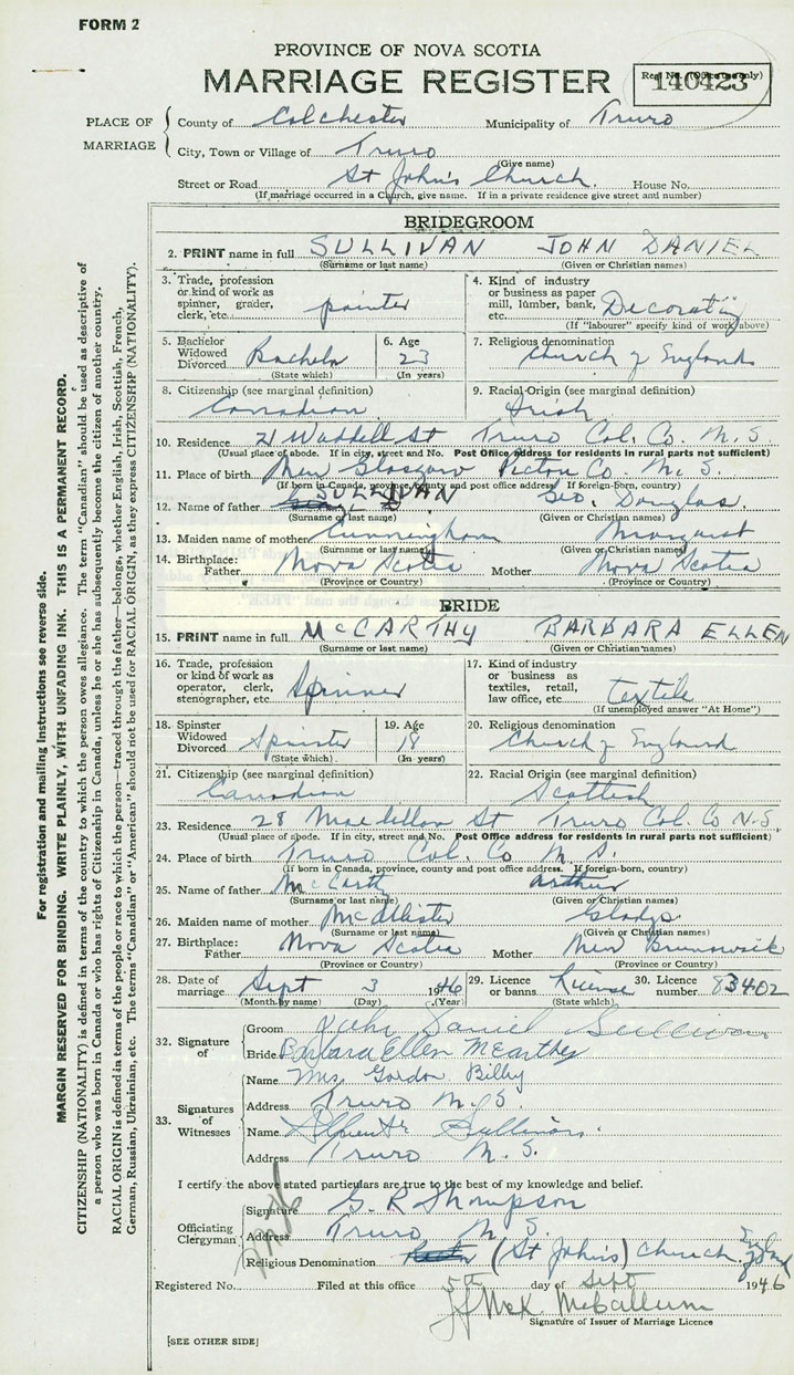 28. Date of marriage September 3 1946 29. By license or banns License 30. License number 83402