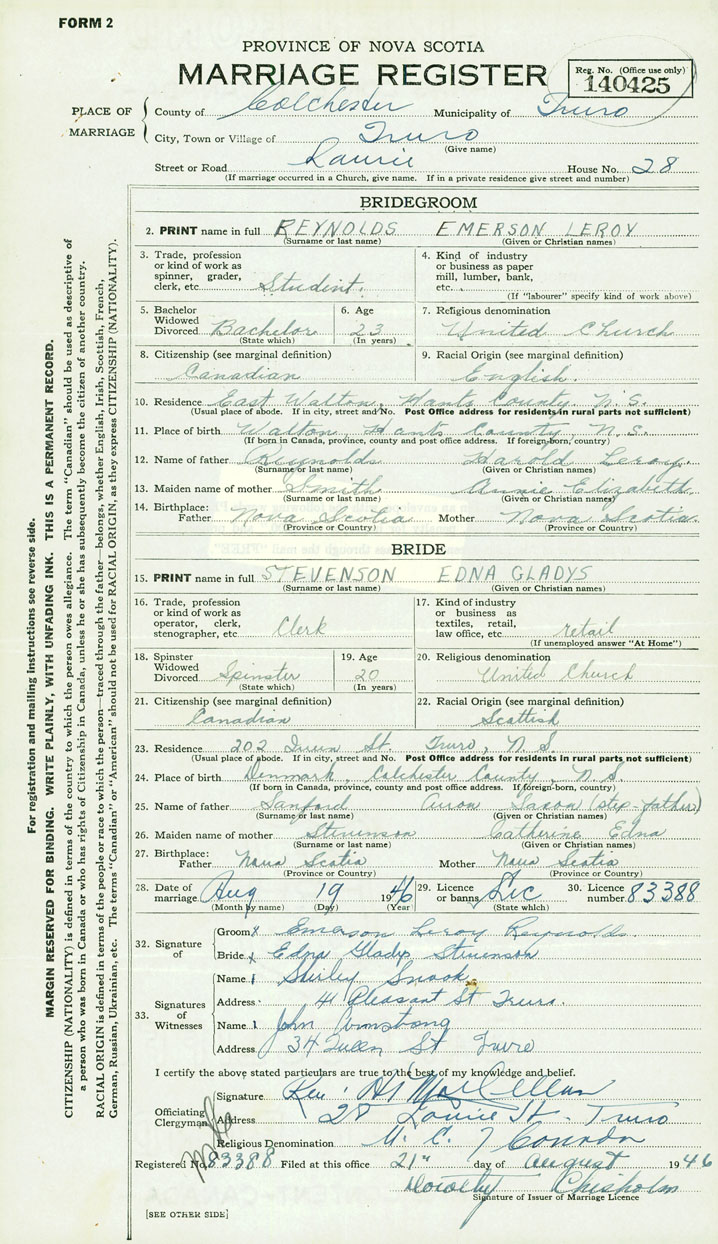 28. Date of marriage August 19 1946 29. By license or banns License 30. License number 83388
