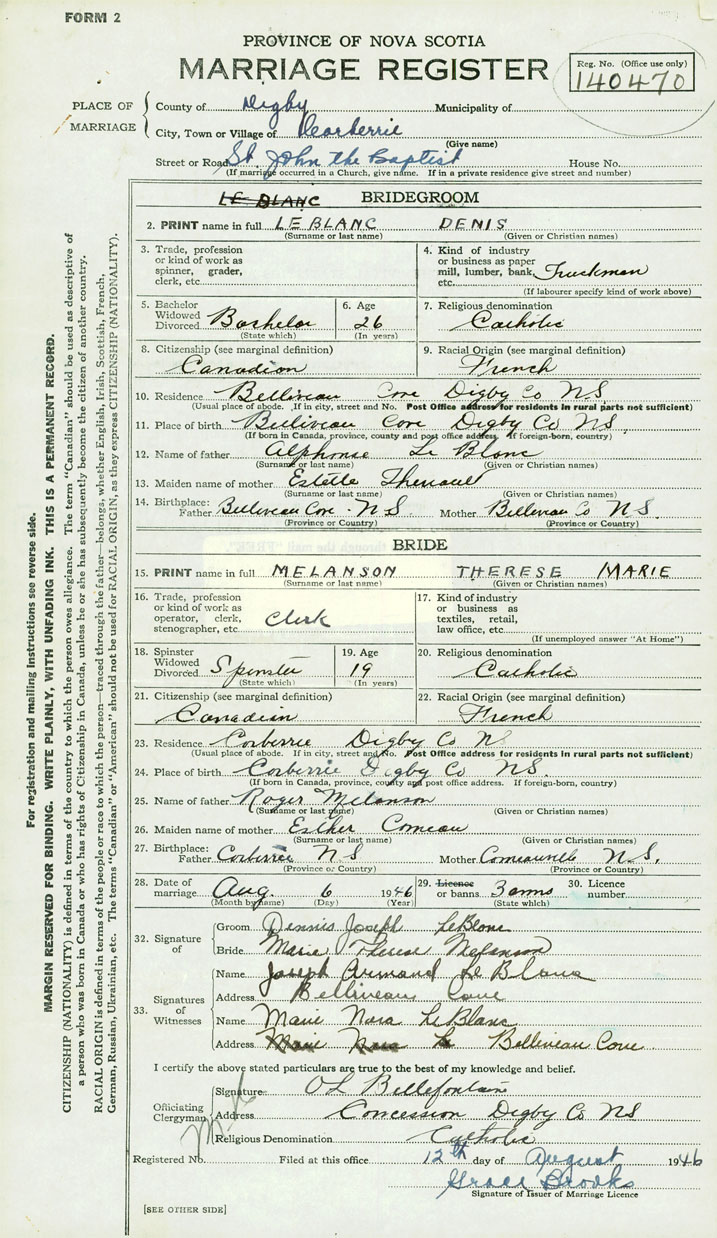 14. Birthplace Father Belliveau Cove, Digby County Mother Belliveau Cove, Digby County