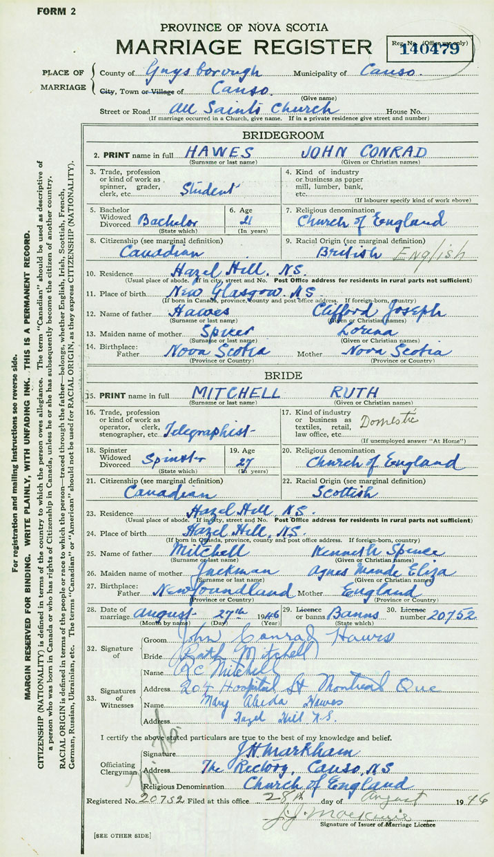 28. Date of marriage August 27 1946 29. By license or banns License 30. License number 20752