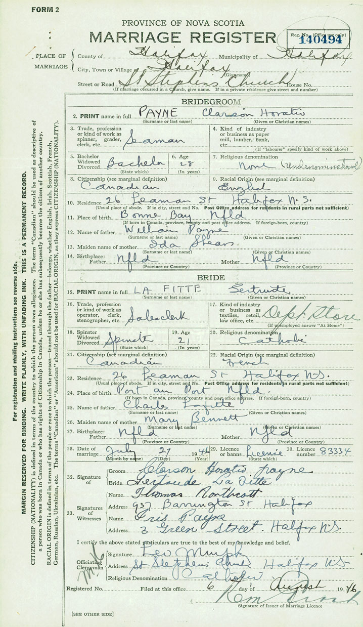 28. Date of marriage July 27 1946 29. By license or banns License 30. License number 83334