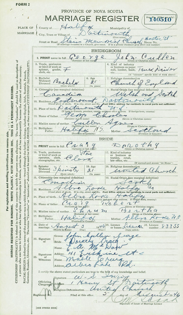28. Date of marriage August 3 1946 29. By license or banns License 30. License number 83355