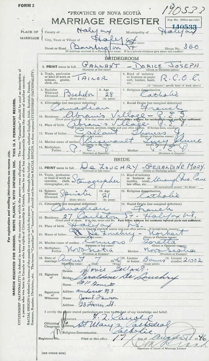 28. Date of marriage August 7 1946 29. By license or banns License 30. License number Banns 21002