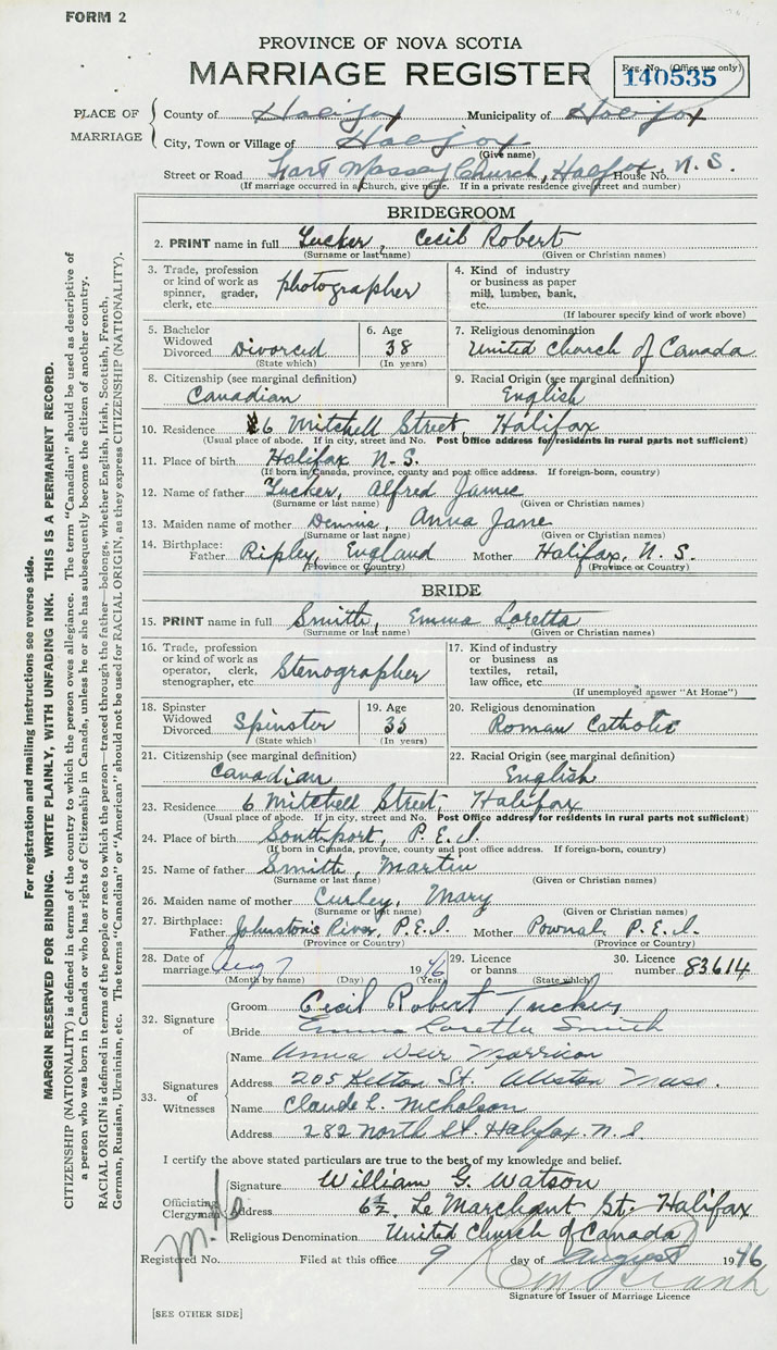 28. Date of marriage August 7 1946 29. By license or banns License 30. License number 83614