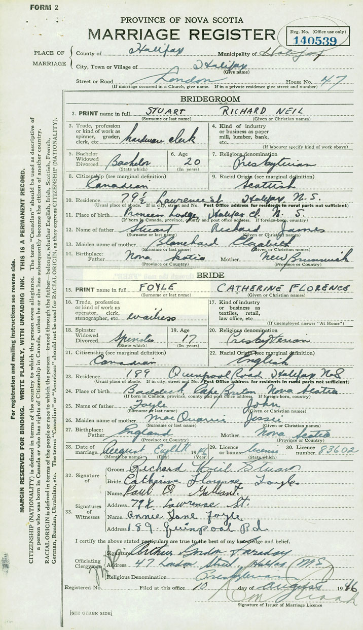 28. Date of marriage August 8 1946 29. By license or banns License 30. License number 83602
