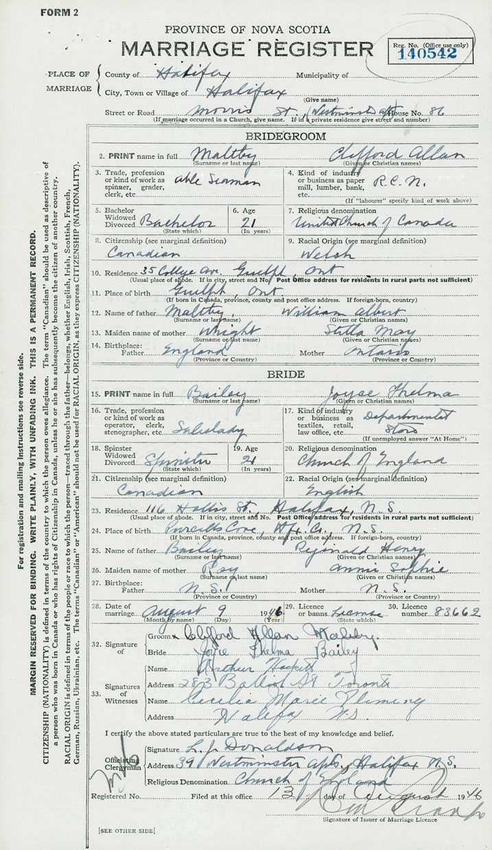 28. Date of marriage August 9 1946 29. By license or banns License 30. License number 83662