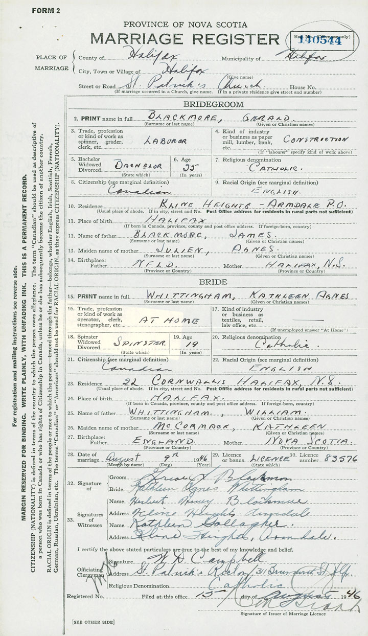 28. Date of marriage August 9 1946 29. By license or banns License 30. License number 83576