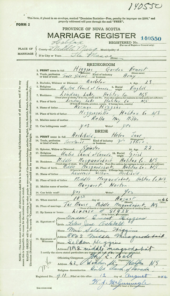 26. Place of marriage The Manse Middle Musquodoboit, Halifax County