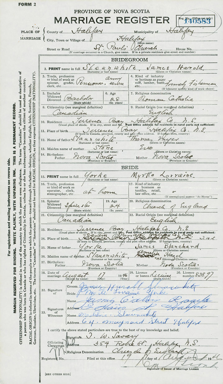 28. Date of marriage August 17 1946 29. By license or banns License 30. License number 83897