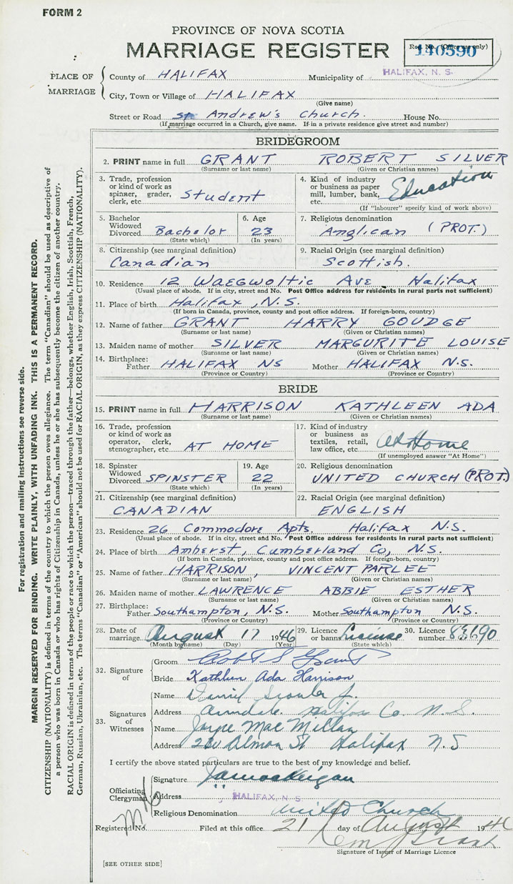 28. Date of marriage August 17 1946 29. By license or banns License 30. License number 83690