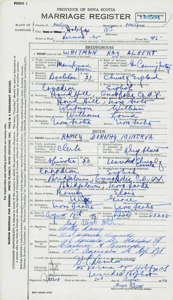 28. Date of marriage August 19 1946 29. By license or banns License 30. License number 83208