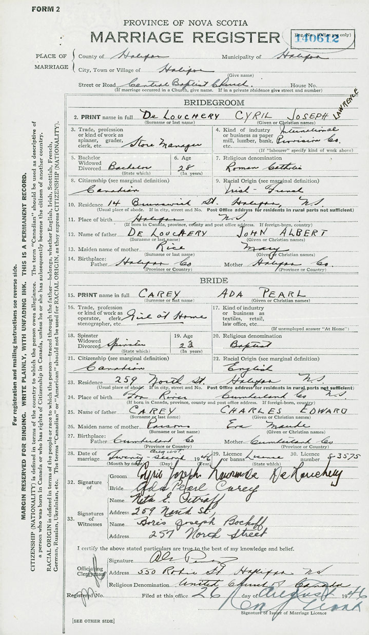 28. Date of marriage August 22 1946 29. By license or banns License 30. License number 83575