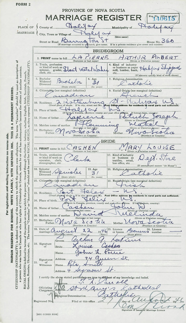 28. Date of marriage August 22 1946 29. By license or banns License 30. License number