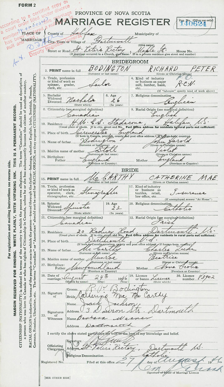 28. Date of marriage August 24 1946 29. By license or banns License 30. License number 83902
