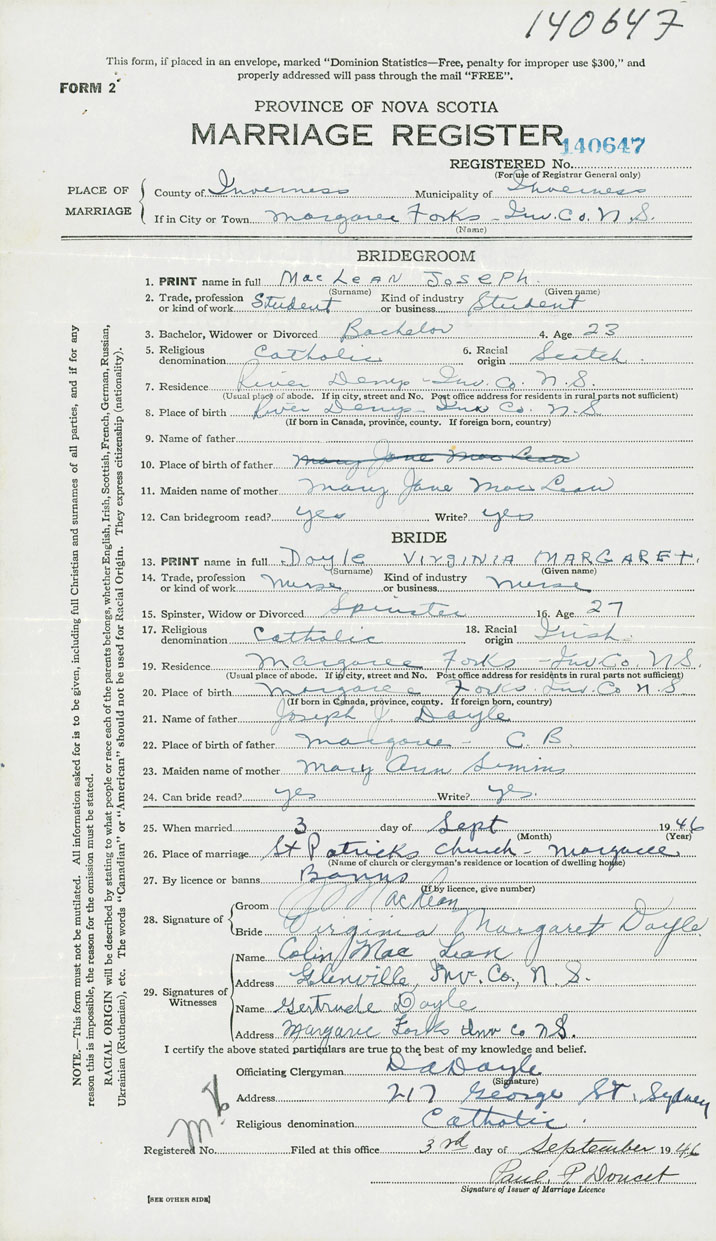 PLACE OF MARRIAGE County of Inverness in City or Town Margaree Forks