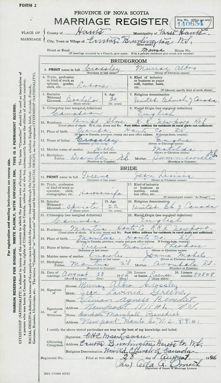 28. Date of marriage August 23 1946 29. By license or banns License 30. License number 80508