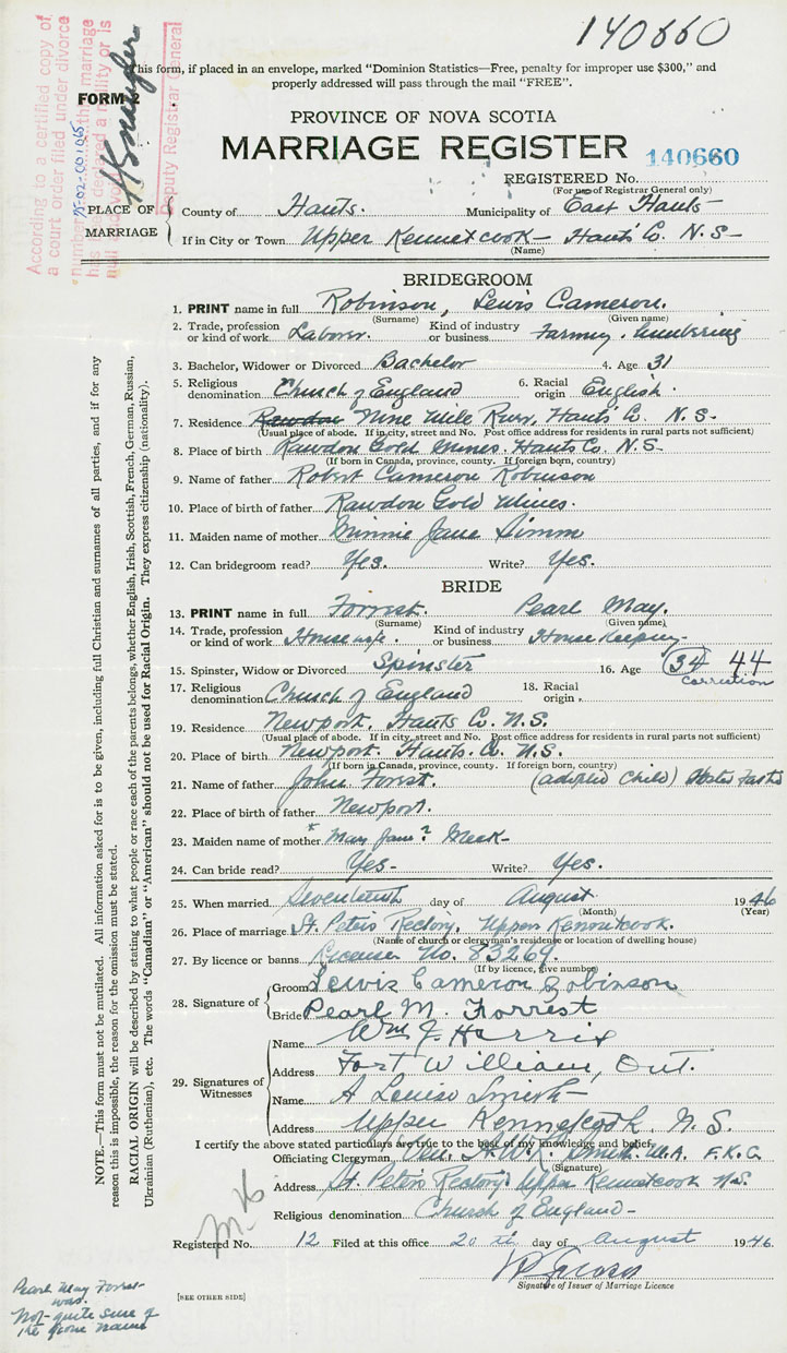 According to a certified copy of the Decree Absolute for Divorce dated 1975-- and filed in the Office of the Registrar General under Divorce number 75-02-001065, it is ordered that the marriage of Lewis Cameron Robinson and Pearl May Forrest (Registered under marriage number 1946-140660) be null and void.