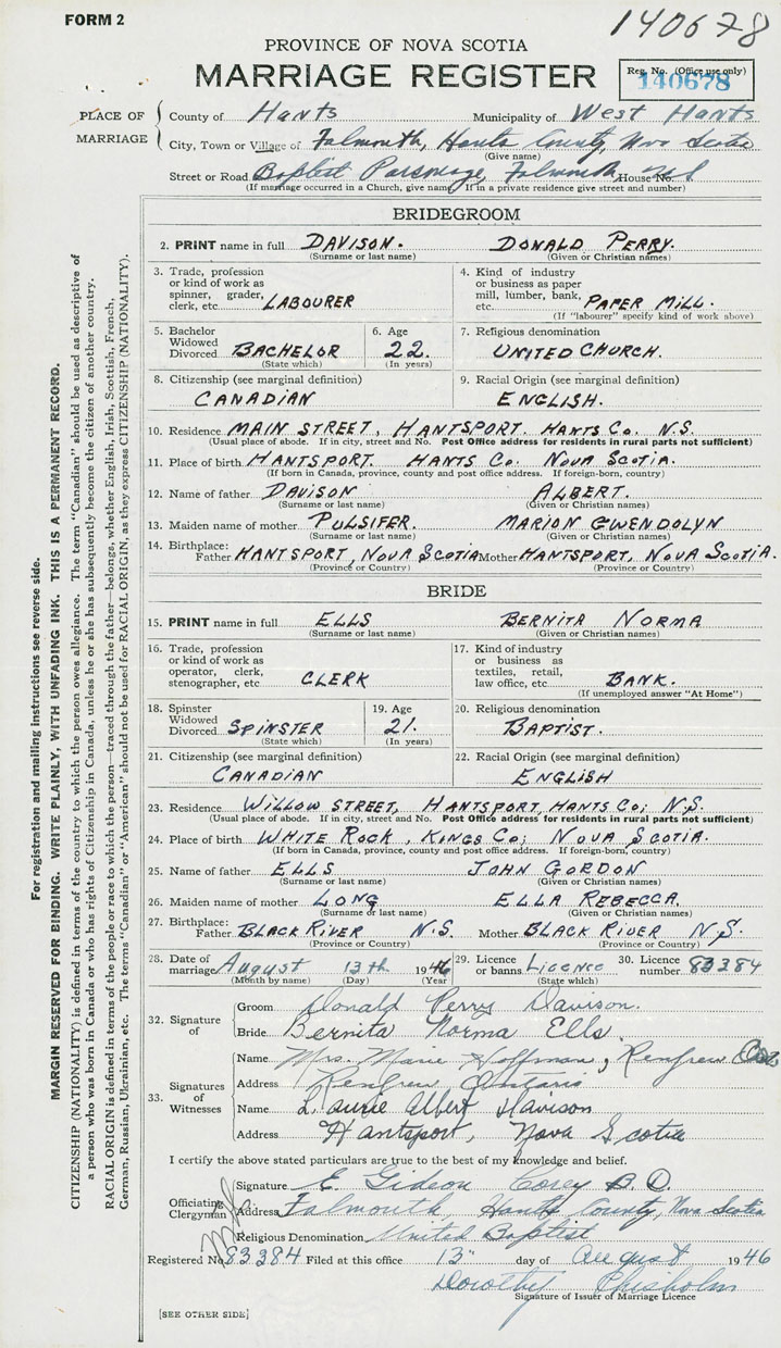 28. Date of marriage August 13 1946 29. By license or banns License 30. License number 83384
